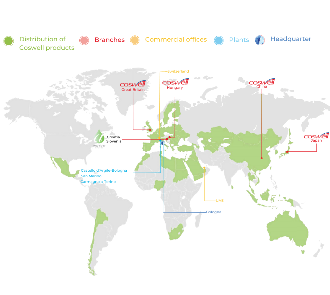Coswell powstaje w Bolonii i ma swoją główną siedzibę w Funo di Argelato, a największe zakłady produkcyjne w Castello D’Argile i w San Marino; kolejne zakłady produkcyjne są ulokowane w północnych Włoszech.